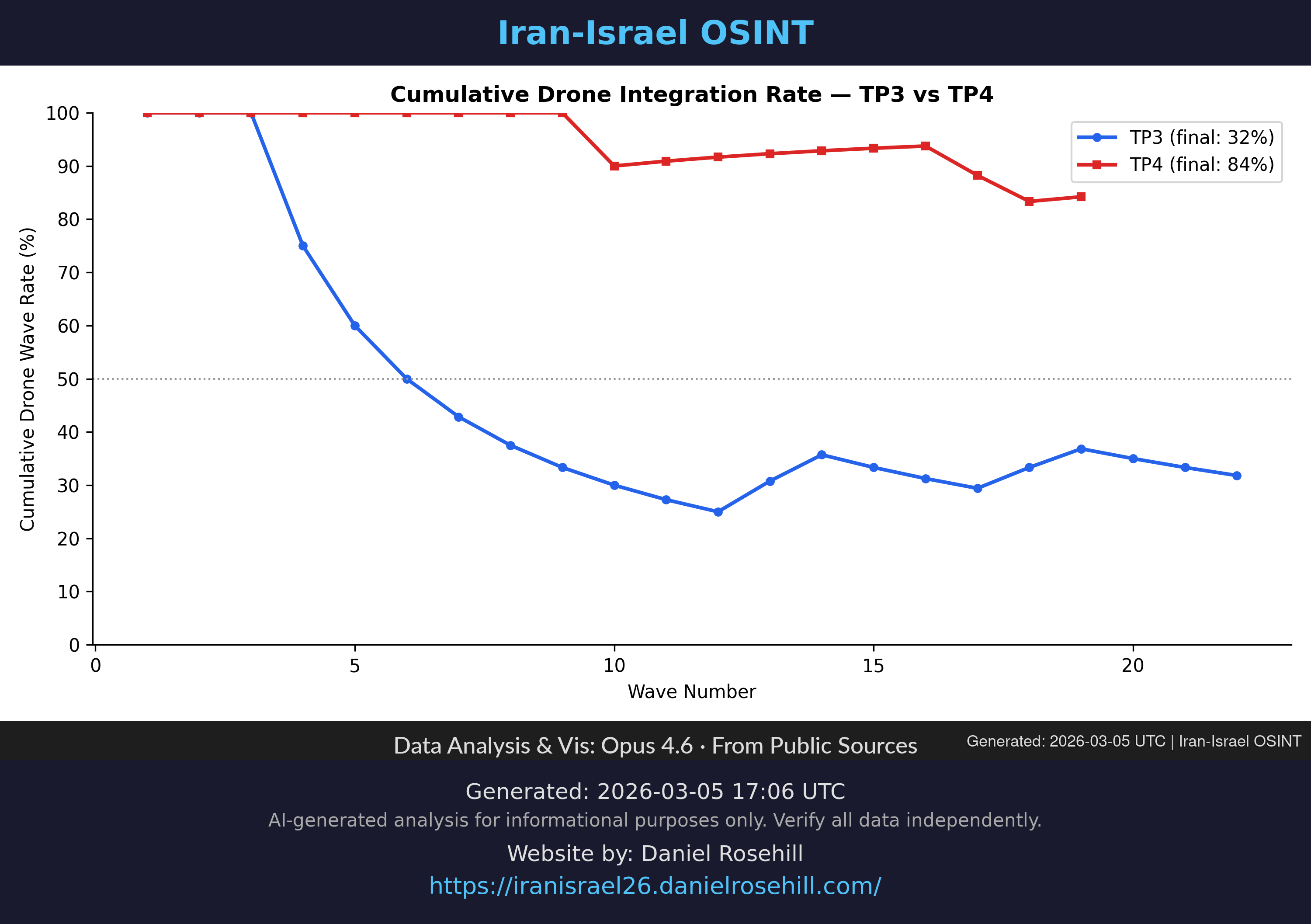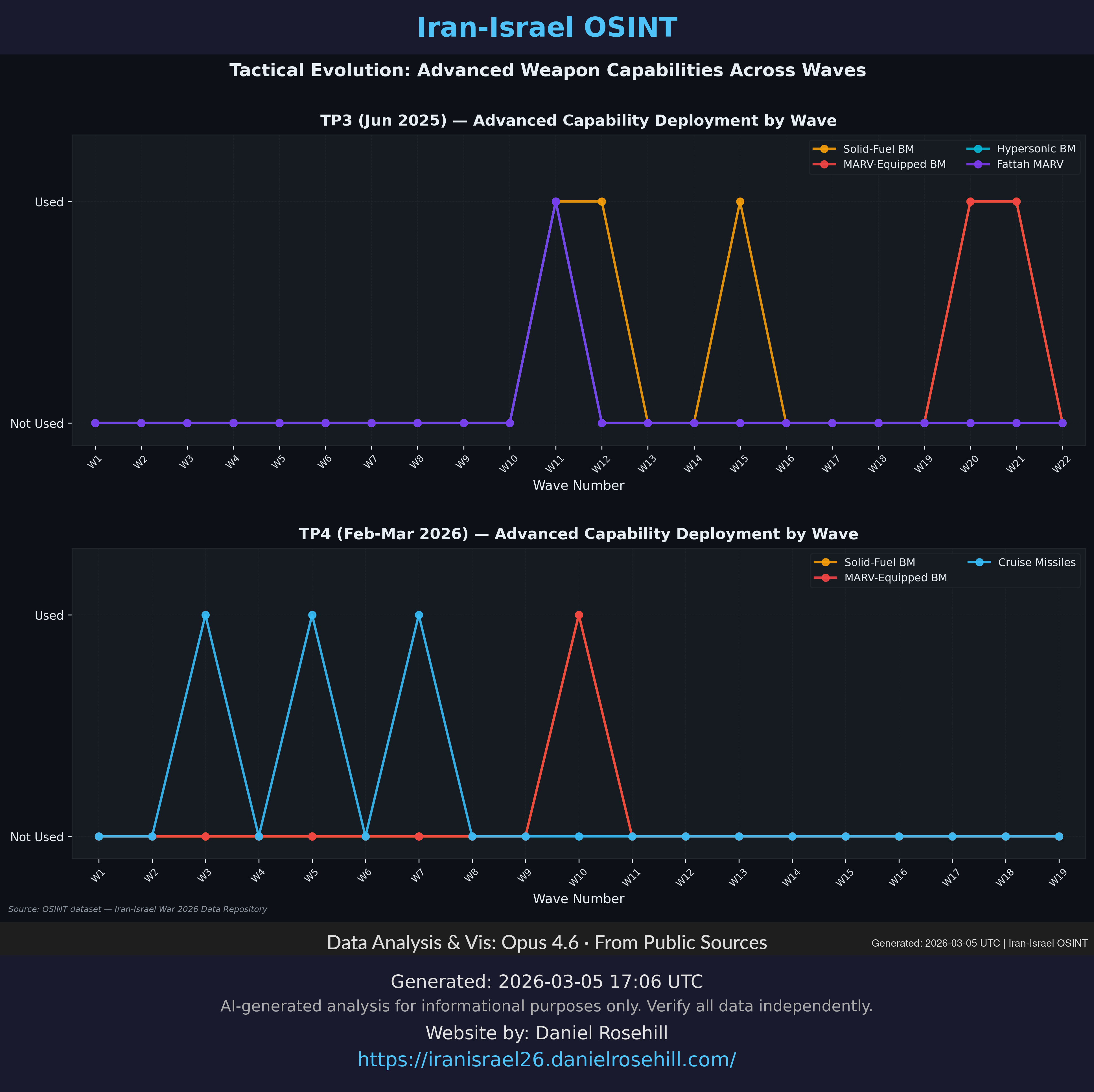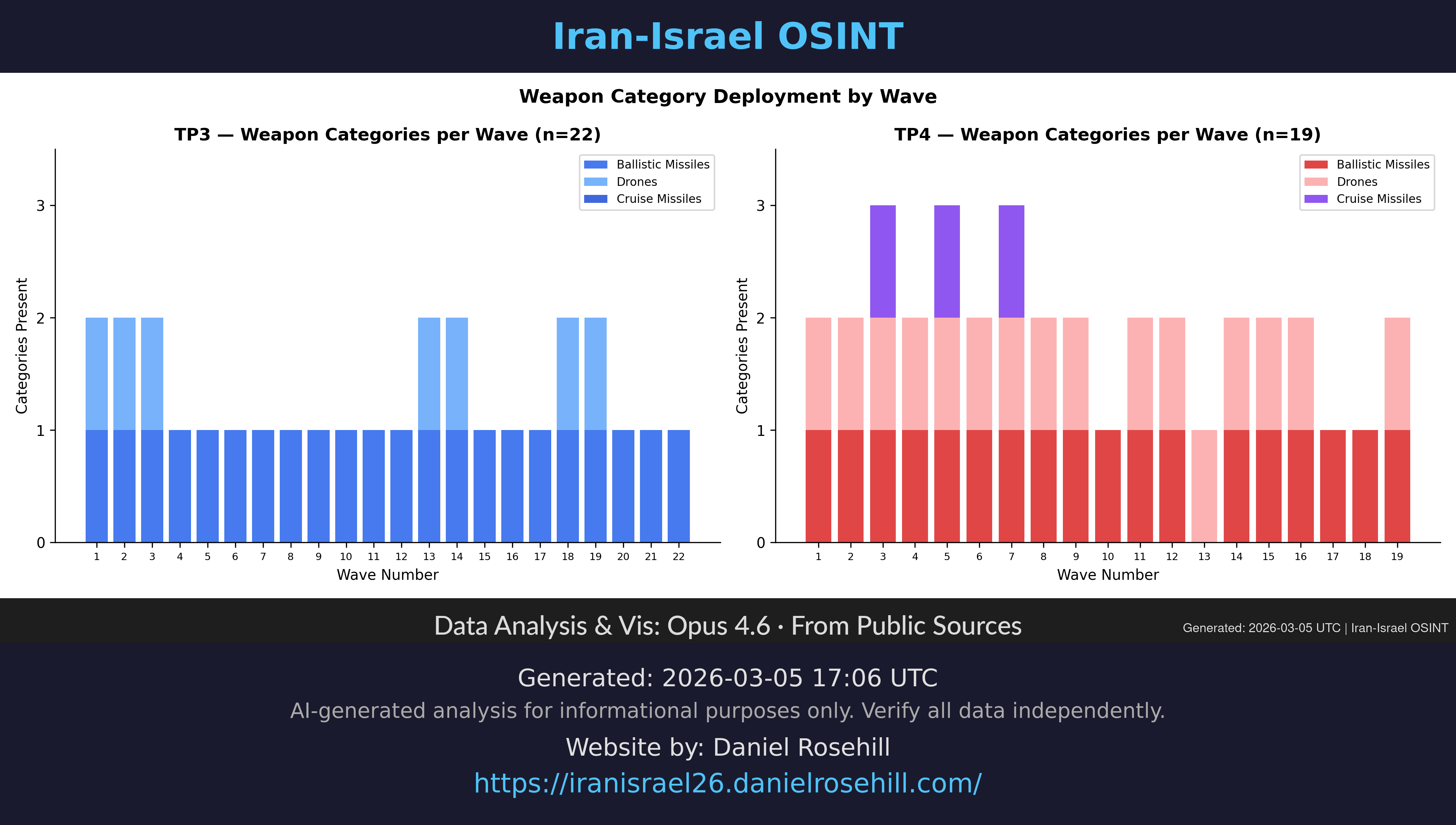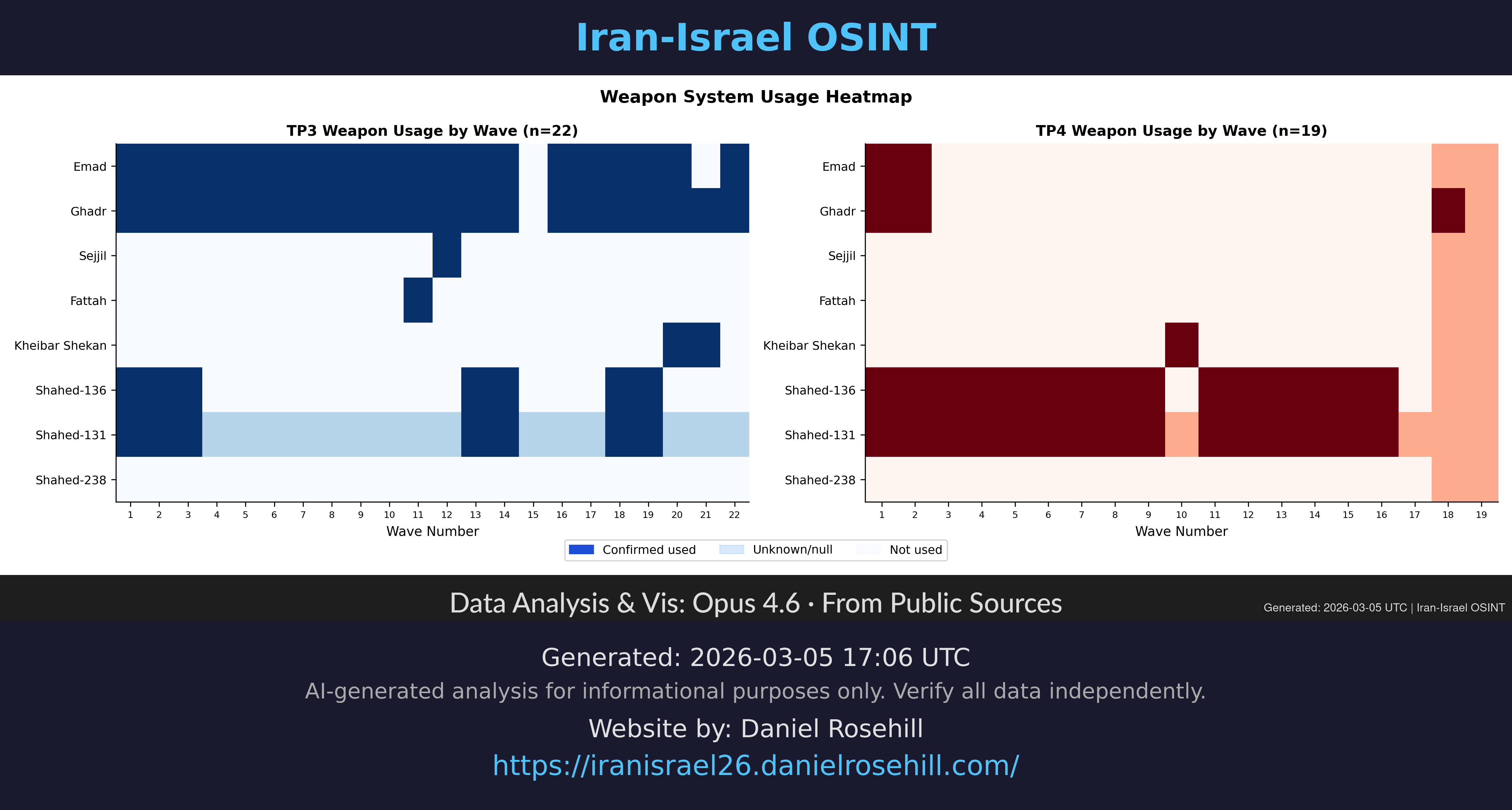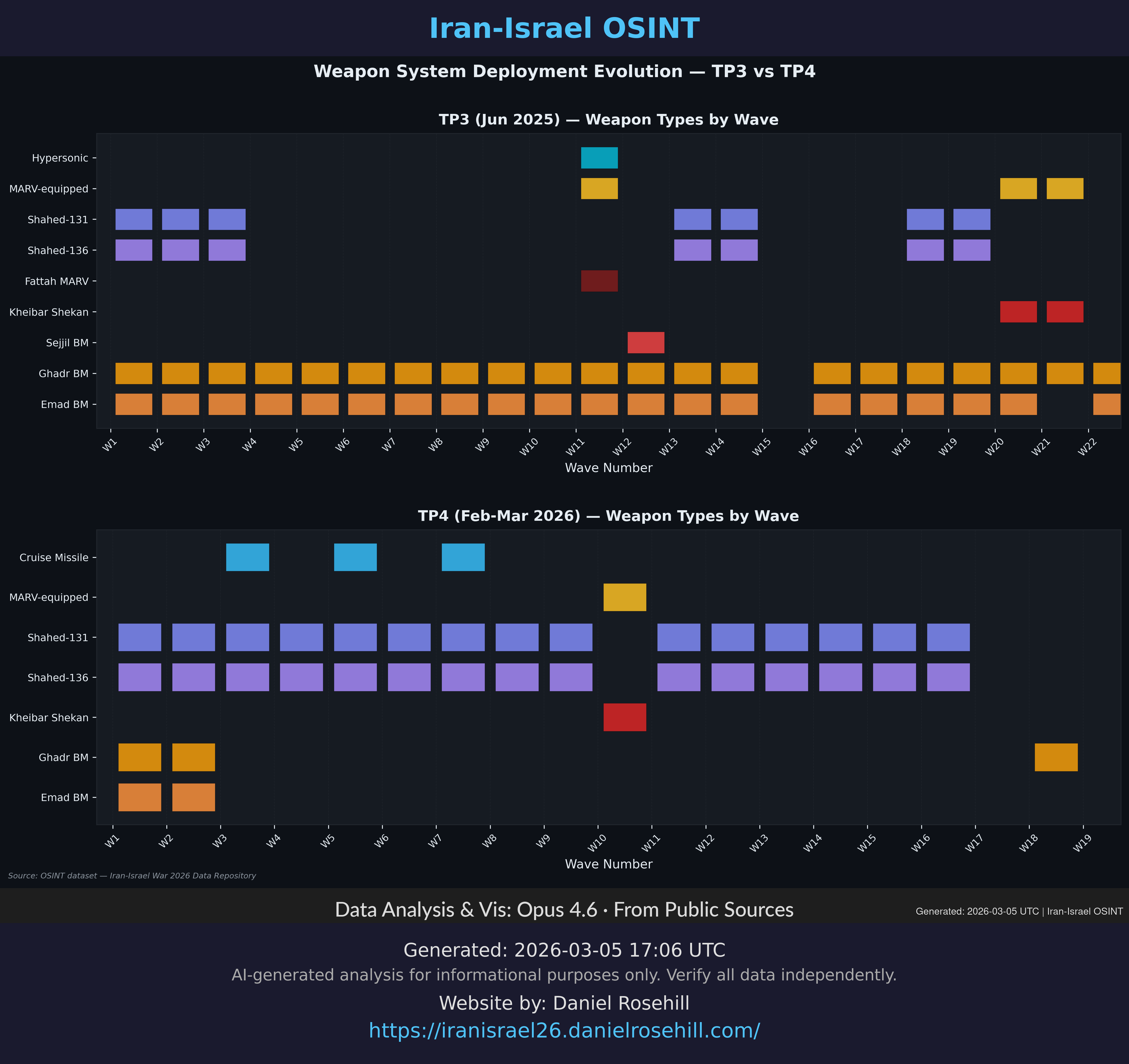 Heatmap showing which Iranian weapon systems were used in each wave across TP3 and TP4.