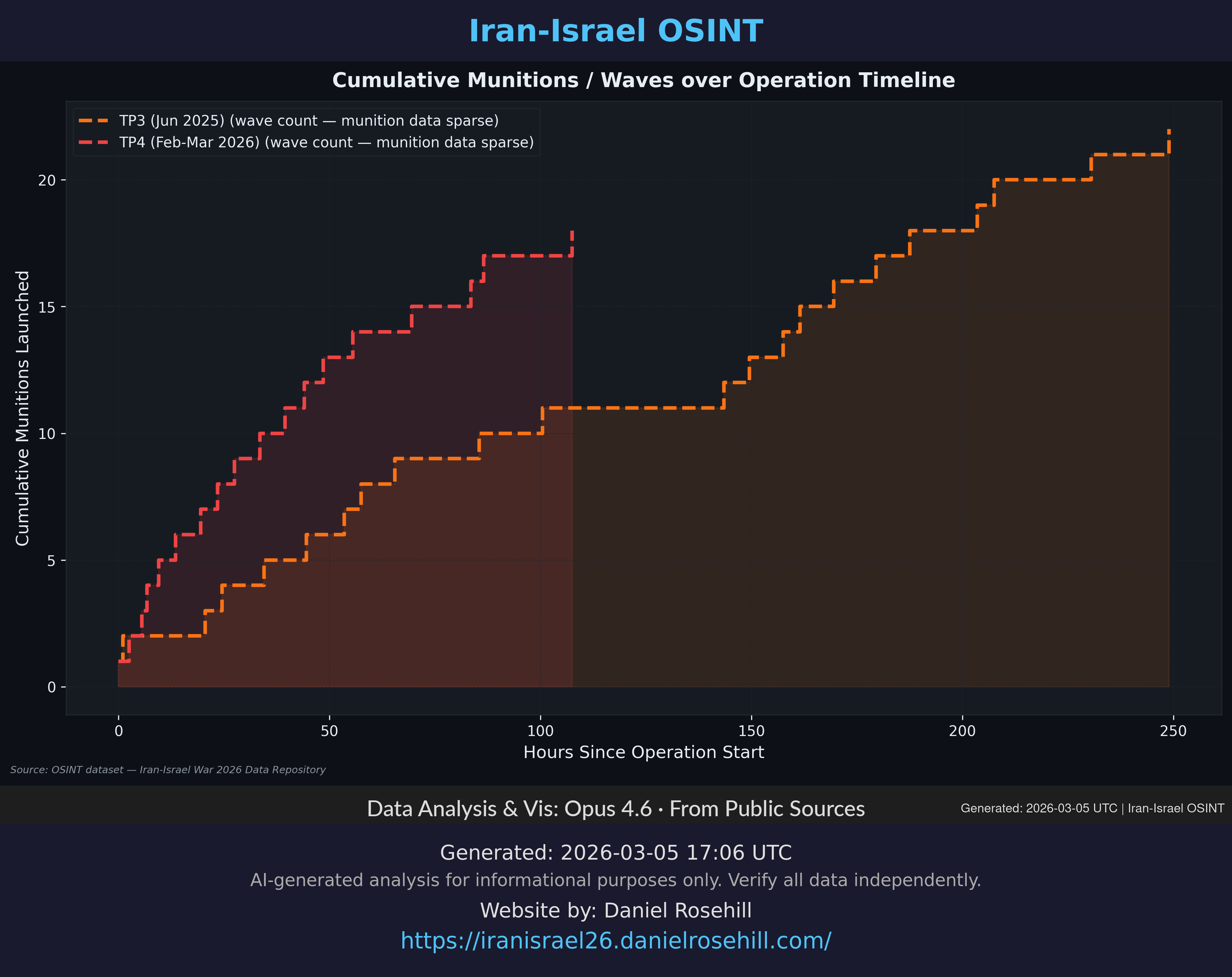 Running total of munitions fired across all waves — shows the acceleration curve of each operation.