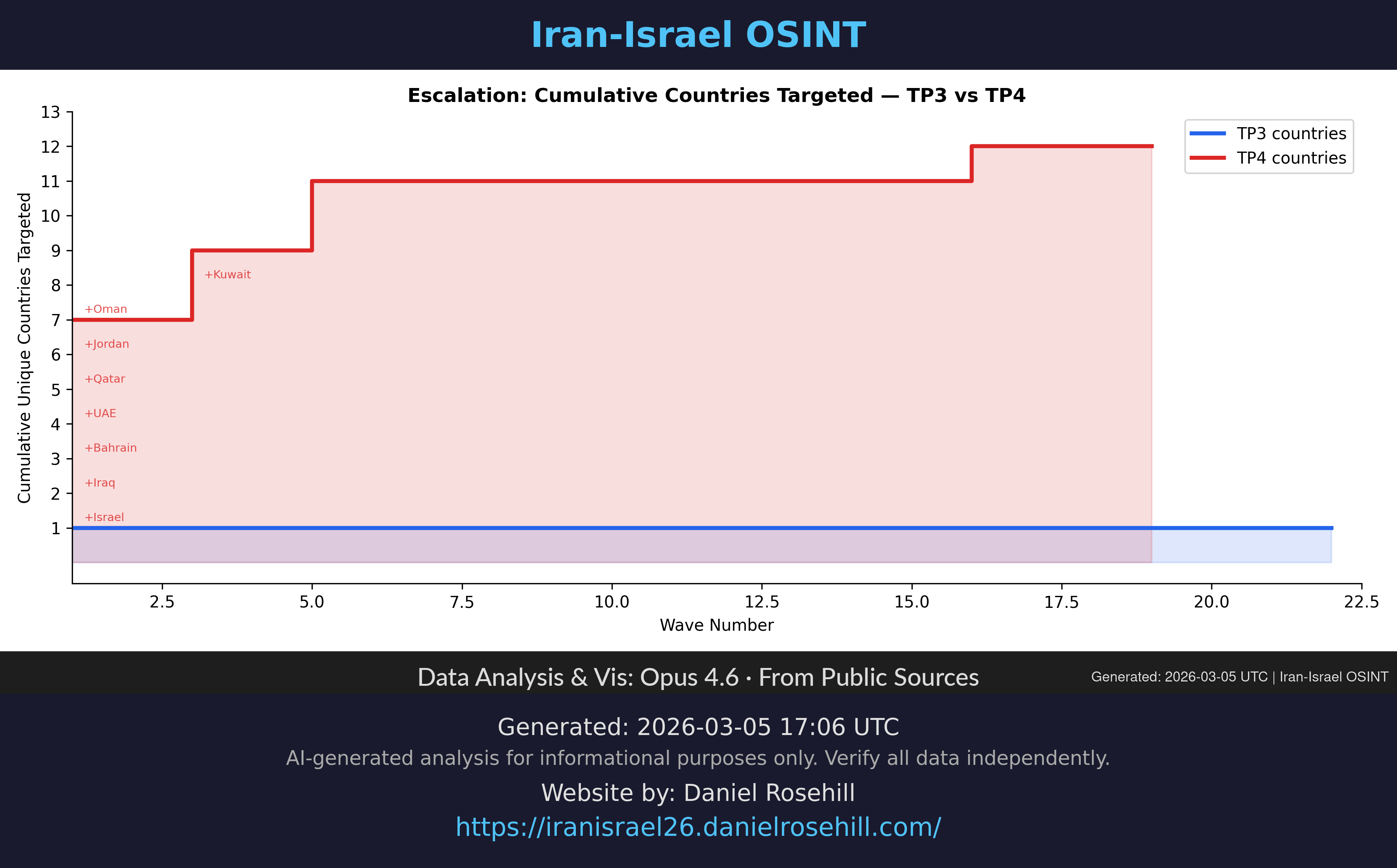 Cumulative countries targeted over time — visualizing the step-by-step geographic expansion of Iranian strikes.